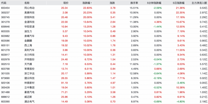 6月11日,汽車(chē)零部件板塊開(kāi)盤(pán)多股飆漲。截至記者發(fā)稿,同心傳動(dòng)(證券代碼:833454.BJ)漲22.83%,美晨科技(證券代碼:300237.SZ)、欣銳科技(證券代碼:300745.SZ)20cm漲停,金道科技(證券代碼:3001279.SZ)、華陽(yáng)變速(證券代碼:839946.BJ)、迪生力(證券代碼:603335.SH)等多只個(gè)股漲逾10%。