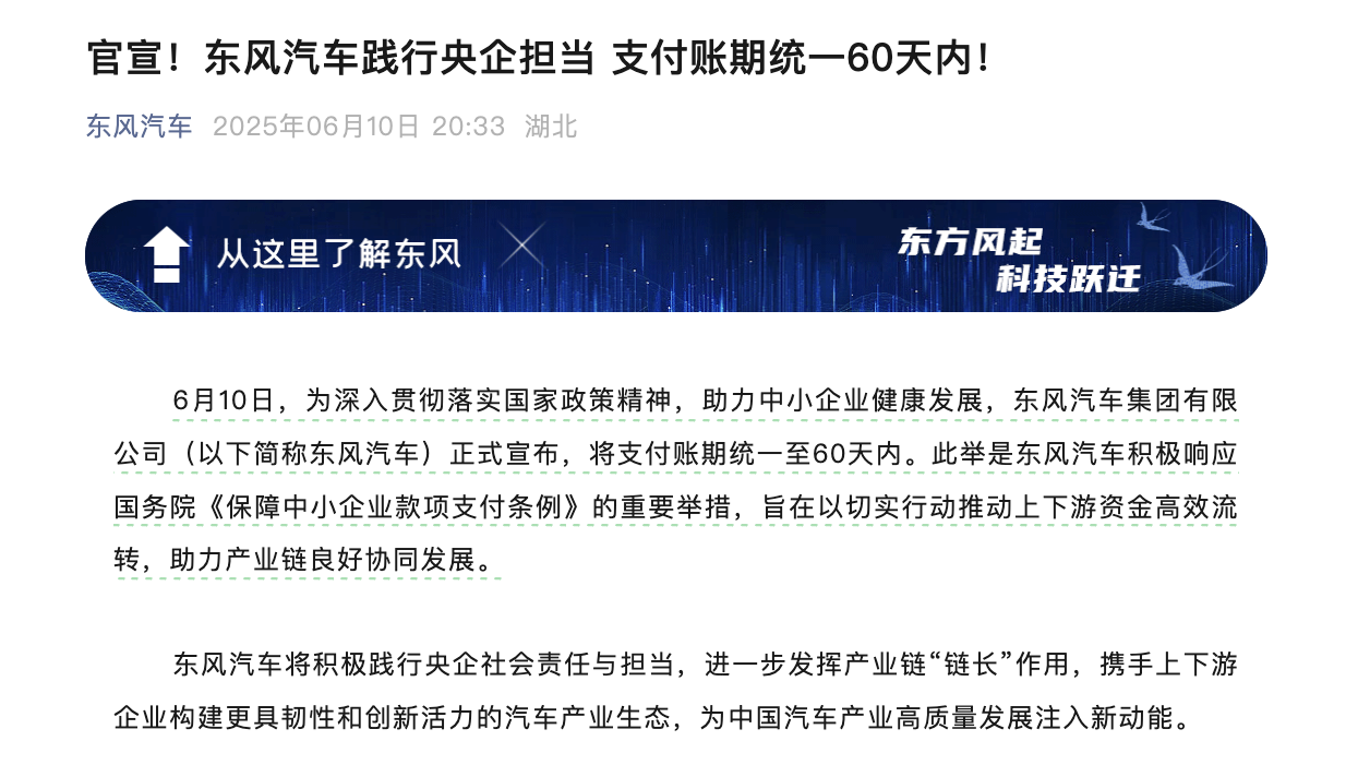 6月10日晚間,中國(guó)第一汽車(chē)集團(tuán)有限公司、東風(fēng)汽車(chē)集團(tuán)有限公司、廣州汽車(chē)集團(tuán)股份有限公司、賽力斯集團(tuán)股份有限公司率先做出承諾將供應(yīng)商支付賬期統(tǒng)一嚴(yán)格限定在60天以內(nèi)。隨后吉利汽車(chē)集團(tuán)有限公司、重慶長(zhǎng)安汽車(chē)股份有限公司、比亞迪股份有限公司、奇瑞汽車(chē)股份有限公司、小鵬汽車(chē)有限公司等車(chē)企跟進(jìn)。這不僅是響應(yīng)《條例》的強(qiáng)制要求,更是行業(yè)領(lǐng)軍者挺身而出,以實(shí)際行動(dòng)抵制惡性競(jìng)爭(zhēng)、修復(fù)產(chǎn)業(yè)生態(tài)的反內(nèi)卷宣言。