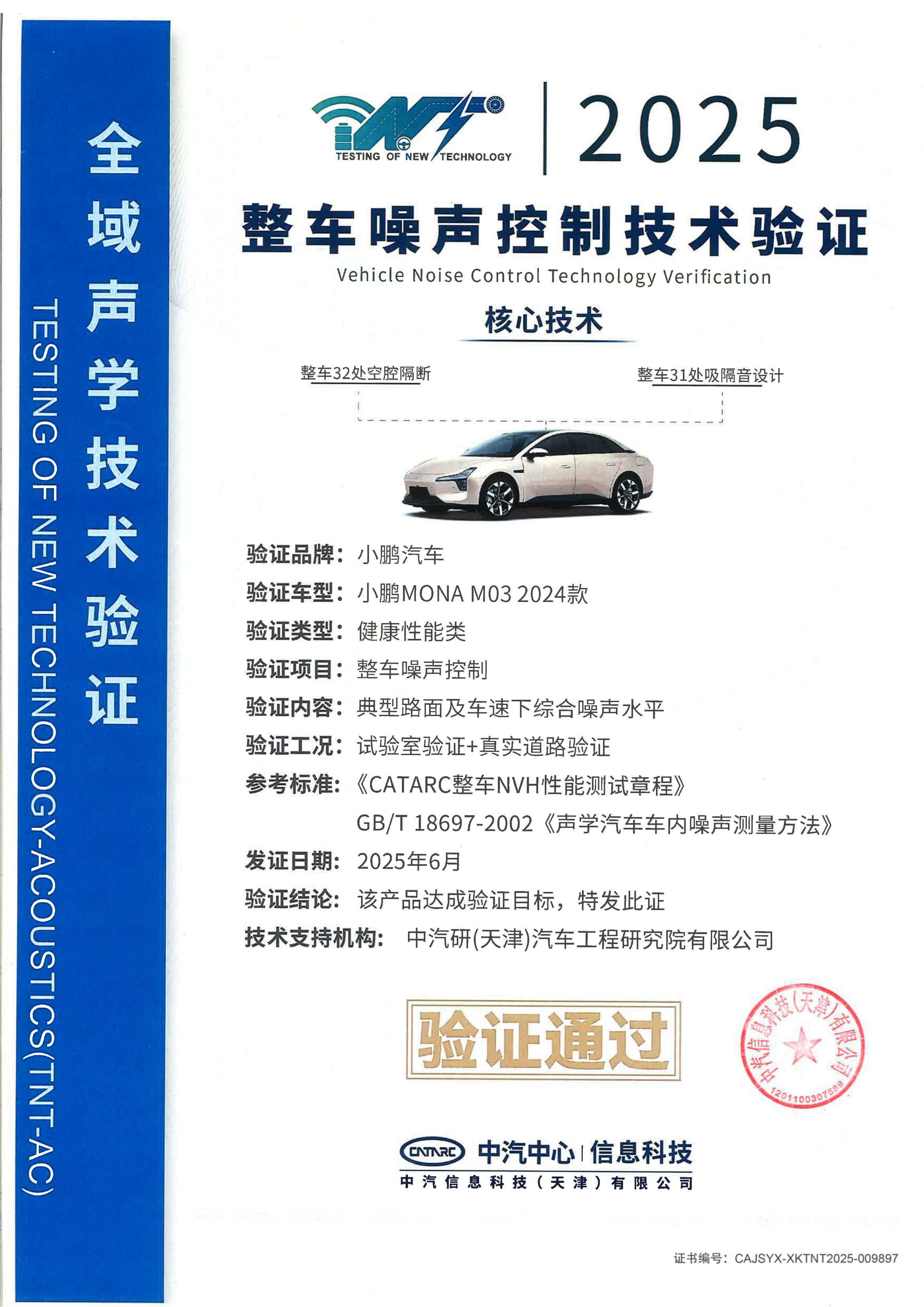 本報(bào)訊 (記者劉釗)近日,小鵬MONAM03榮獲中國(guó)汽車技術(shù)研究中心(以下簡(jiǎn)稱“中汽研”)頒發(fā)的《整車噪聲控制技術(shù)驗(yàn)證》認(rèn)證,成為首個(gè)通過該項(xiàng)認(rèn)證的車型。這項(xiàng)認(rèn)證不僅是對(duì)MONAM03整車靜謐性的權(quán)威背書,也標(biāo)志著小鵬MONA在健康座艙、舒適駕乘領(lǐng)域的研發(fā)實(shí)力再次獲得行業(yè)認(rèn)可。