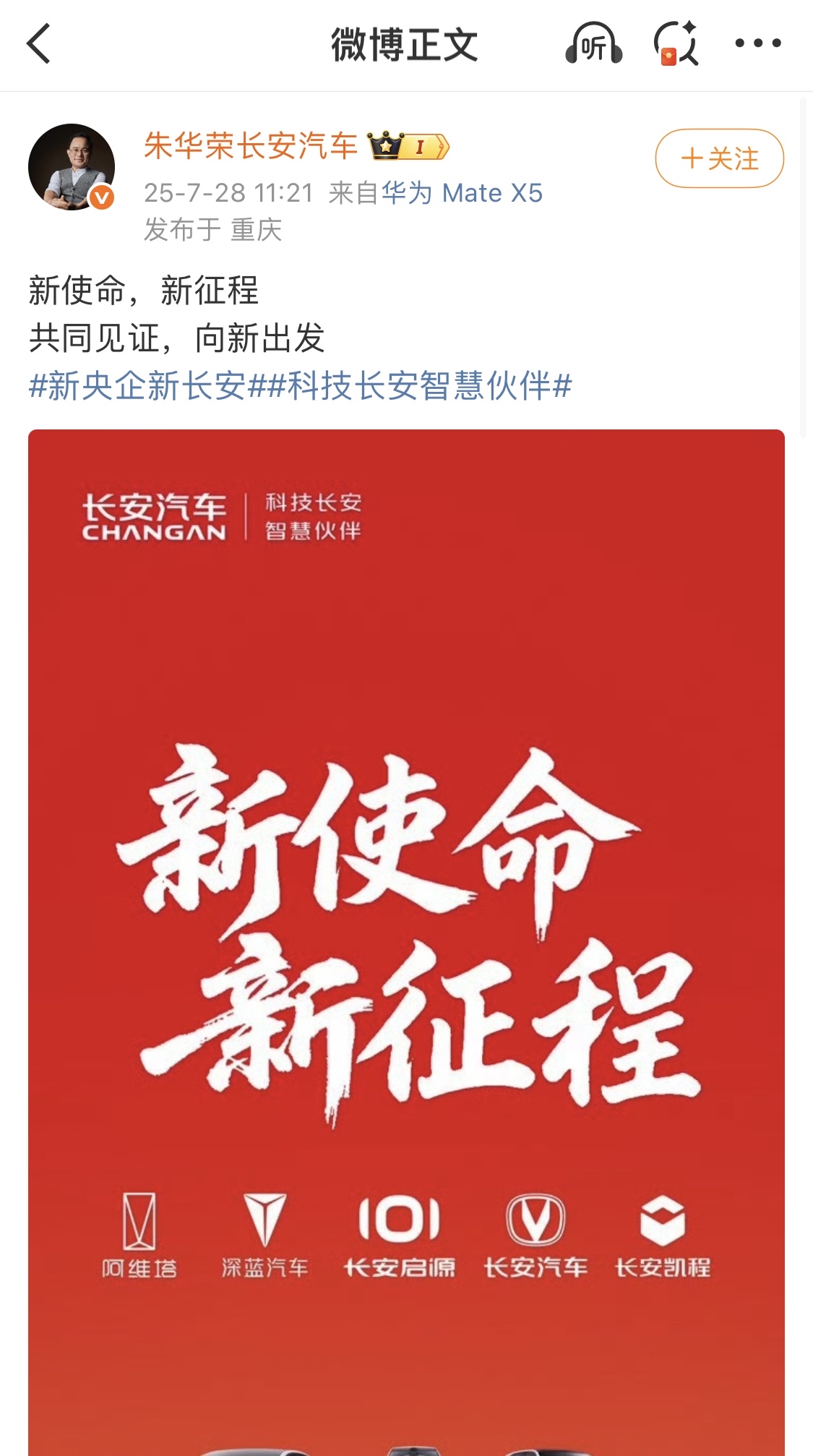 記者注意到,7月28日,認證信息為“中國長安汽車集團有限公司”的“中國長安汽車集團”微博、微信公眾號、微信視頻號等社交平臺賬號已陸續(xù)上線。7月28日上午,重慶長安汽車股份有限公司(以下簡稱“長安汽車”)董事長朱華榮在微博發(fā)文:“新使命,新征程,共同見證,向新出發(fā)。”
