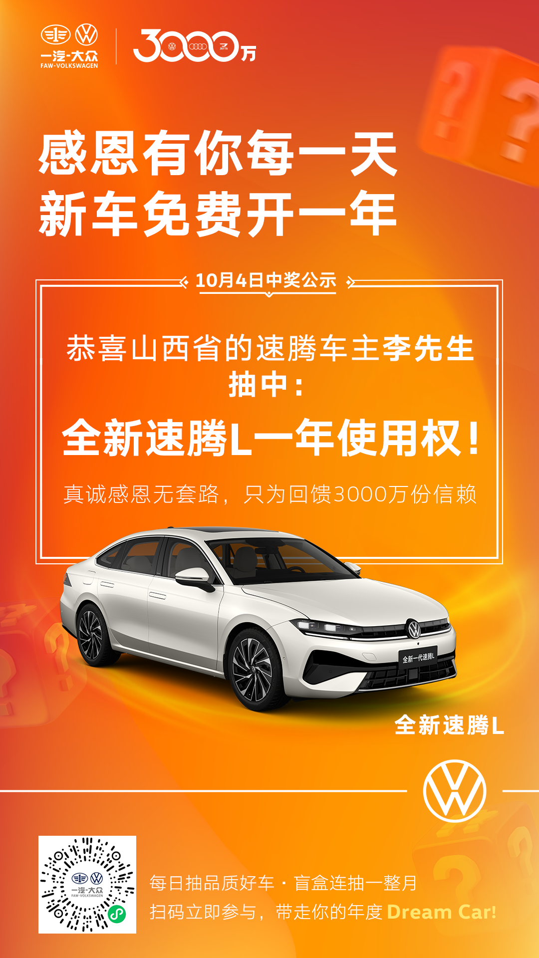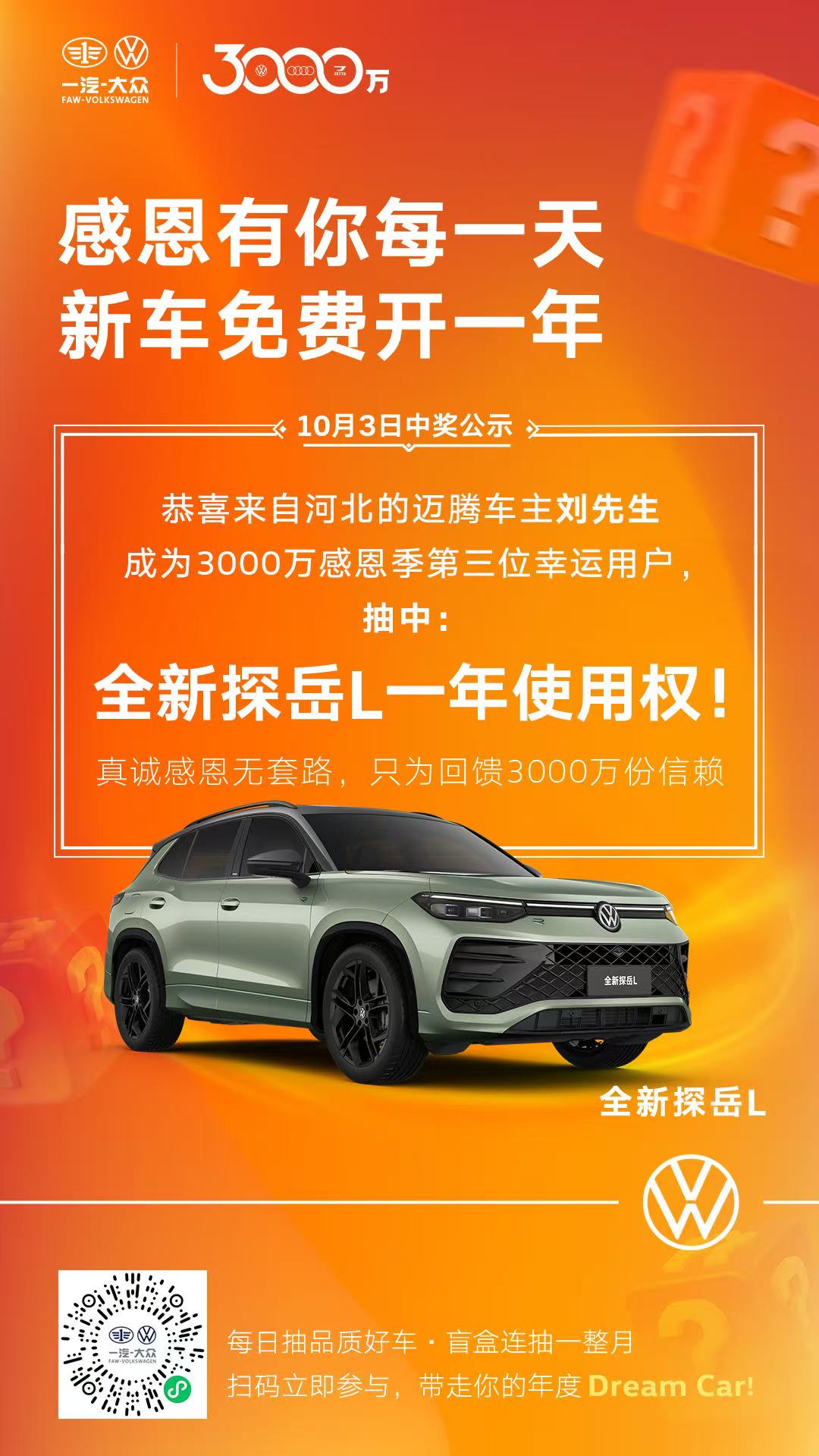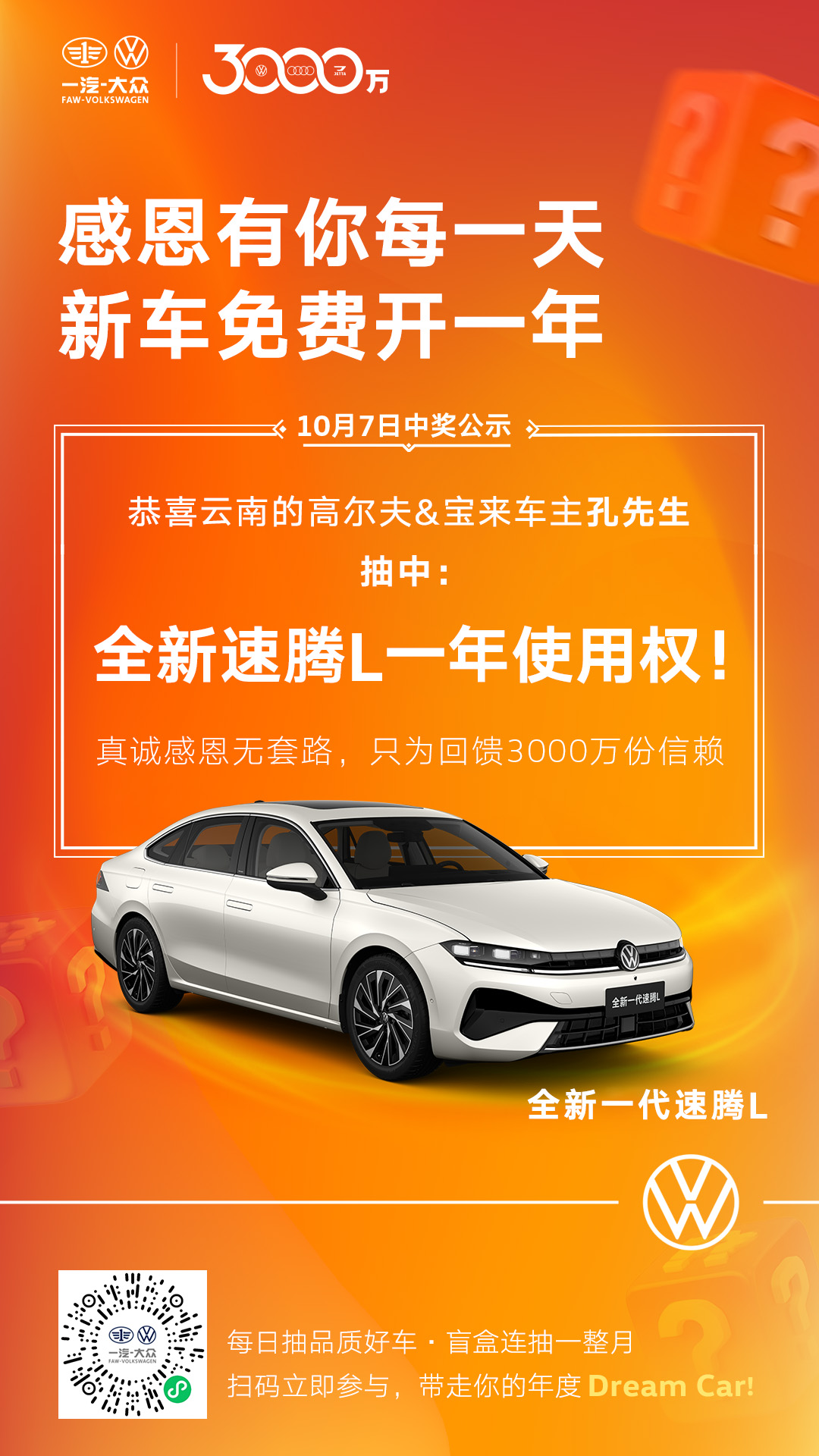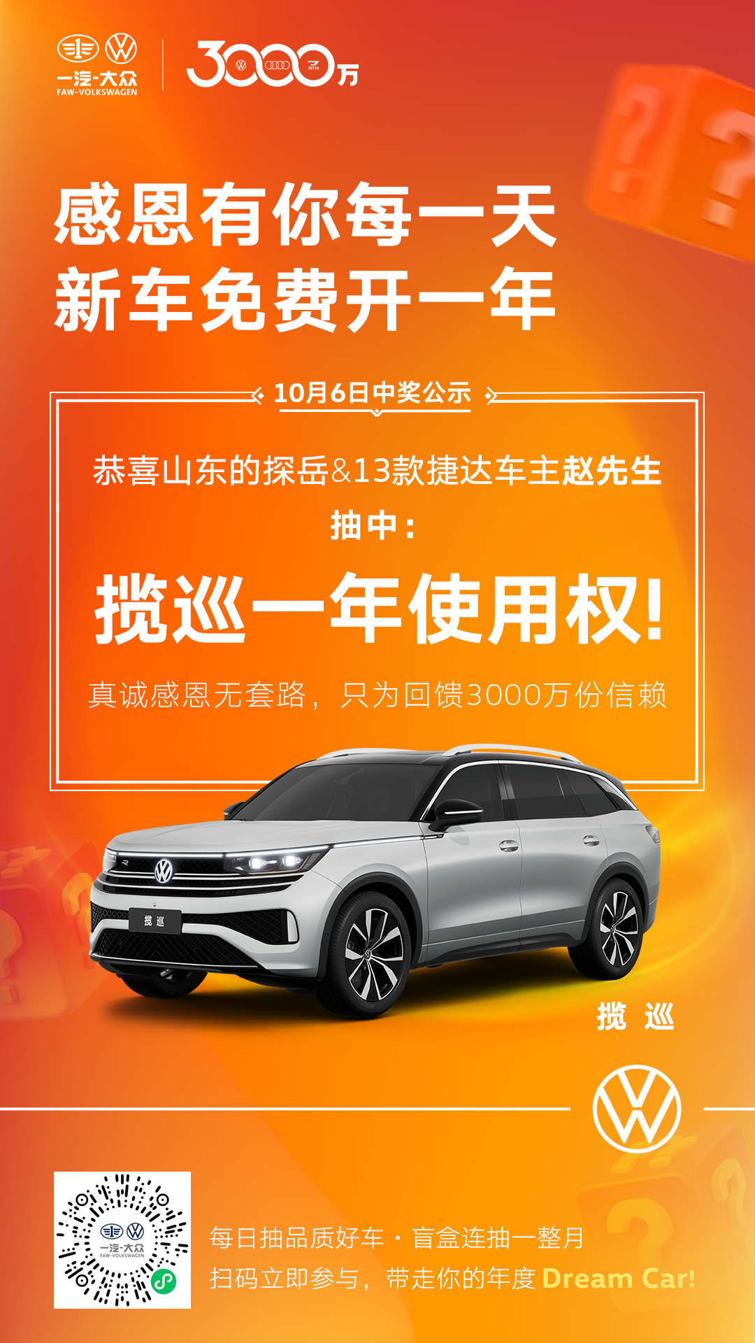 規(guī)模之上是責任,這份責任既是對品質(zhì)的堅守,也是對客戶的承諾,一汽-大眾將“可靠”從產(chǎn)品品質(zhì)延伸至服務領域。為答謝3000萬客戶的支持與信賴,一汽-大眾特別推出“3000萬用戶感恩禮”——車主報名抽取新車“免費開一年”使用權(quán),大眾品牌吸引超過64000位車主報名參與。十一長假期間共誕生八位“幸運星”,分別獲得全新攬境、攬巡、全新探岳L、全新一代速騰L及全新一代邁騰車型的一年使用權(quán)。目前該活動仍在火熱進行中,10月27日前仍可報名參與。