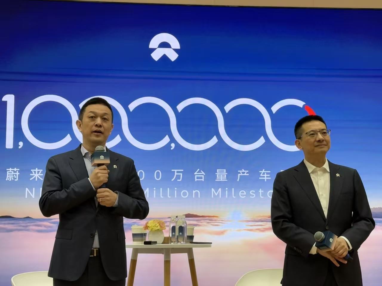 蔚來(lái)創(chuàng)始人、董事長(zhǎng)、CEO李斌,蔚來(lái)聯(lián)合創(chuàng)始人(左)、總裁秦力洪(右)在第100萬(wàn)臺(tái)量產(chǎn)車下線媒體溝通會(huì)上與媒體對(duì)話(劉釗/攝影)