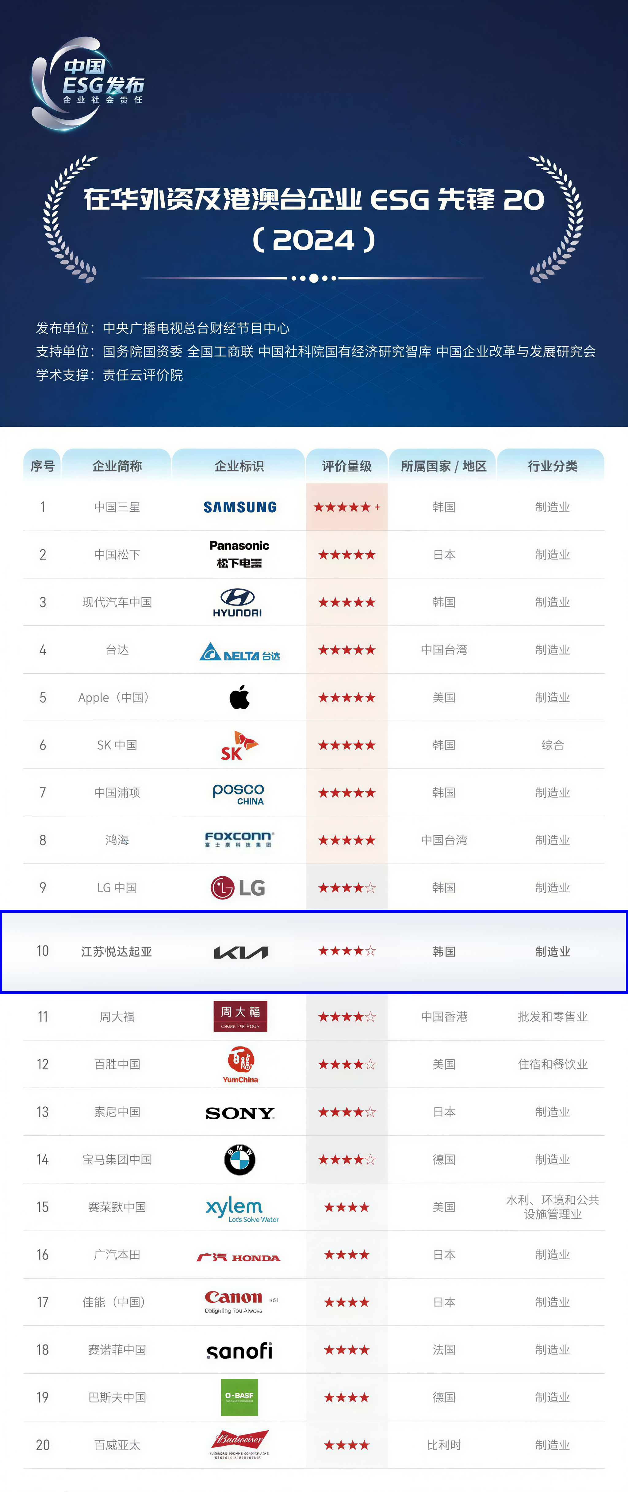 此外,江蘇悅達(dá)起亞還連續(xù)2年入圍中央廣播電視總臺(tái)“在華外資及港澳臺(tái)企業(yè)ESG先鋒”榜單前10,是榜單前10中唯一在華外資子公司企業(yè)。