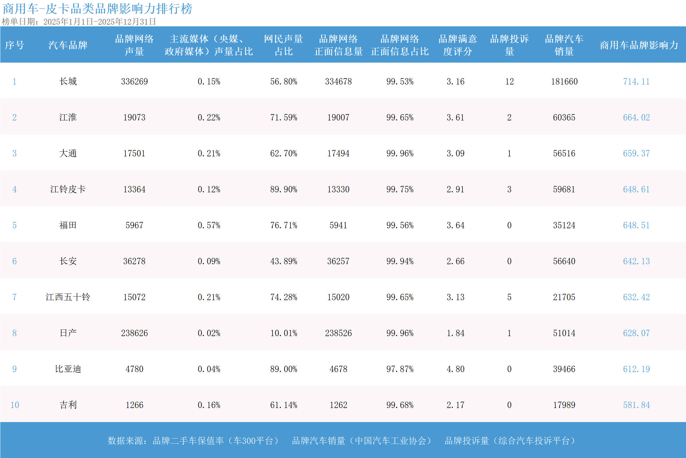 2025年無疑是商用車新能源化從政策引導(dǎo)邁向市場驅(qū)動、從示范運(yùn)營走向規(guī)?;偁幍年P(guān)鍵一年,電動化轉(zhuǎn)型進(jìn)程在不同細(xì)分領(lǐng)域呈現(xiàn)出分化與提速并存的態(tài)勢。在皮卡領(lǐng)域,以雷達(dá)汽車為代表的新勢力憑借鮮明的電動化、戶外生活化定位,成功吸引了輿論的高度關(guān)注,嶄露頭角;在輕卡與輕客市場,吉利遠(yuǎn)程等專注于新能源商用車的品牌,其影響力排名快速上升,憑借在輿論場中更高的網(wǎng)民聲量占比與電動化技術(shù)話題熱度,成功闖入榜單前列,對既有的傳統(tǒng)格局形成了切實(shí)的沖擊與挑戰(zhàn)。