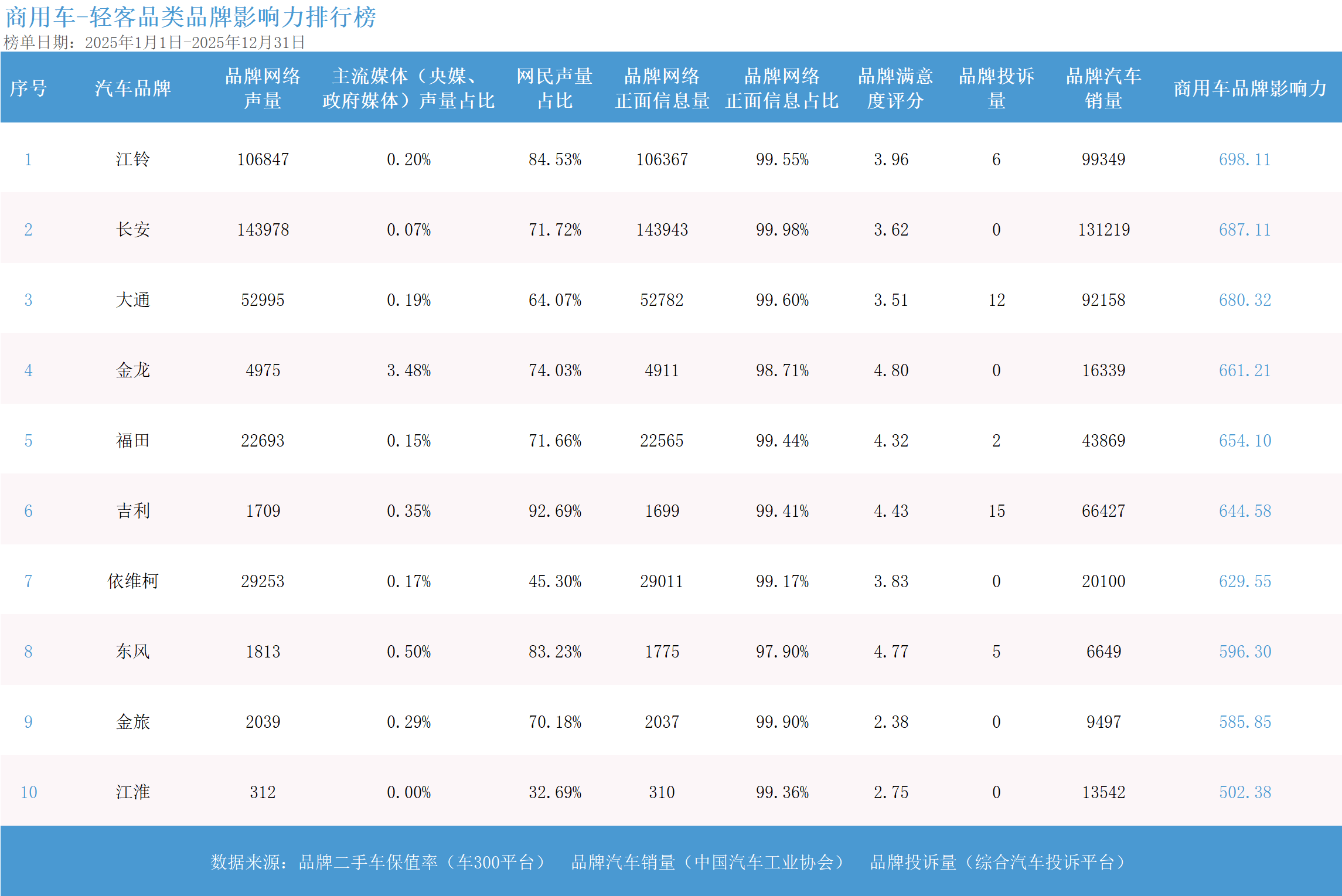 而在輕客市場,江鈴汽車以698.11分再度領(lǐng)跑,其高達(dá)99.55%的正面信息占比與接近10萬輛的年度銷量,生動詮釋了在B端客戶市場中,以“可靠”和“低使用成本”為核心建立的品牌信任所帶來的巨大商業(yè)價值;長安凱程則以超過13萬輛的銷量規(guī)模緊隨其后,并在新能源輕客車型上實(shí)現(xiàn)了快速增長,展現(xiàn)出強(qiáng)大的市場適應(yīng)力。