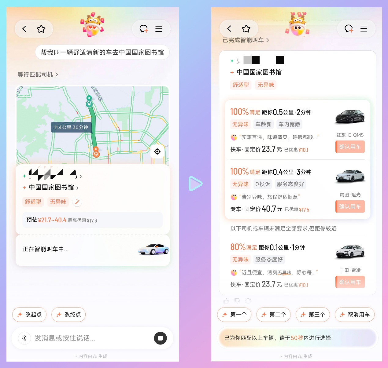 除了一句話選車,小滴也在向更完整的出行助手延展。它也支持查詢附近地點(diǎn)并一鍵叫車、推薦遠(yuǎn)距離行程的換乘方案,以及查詢訂單、預(yù)約叫車等功能。