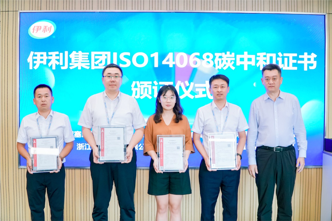 必維集團代表(右一)為伊利產(chǎn)品和工廠頒發(fā)ISO14068“碳中和”證書