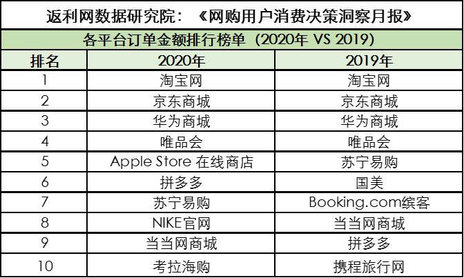 從平臺分布上看,淘寶、京東和華為商城依然穩(wěn)居平臺訂單金額前三,相比2019年,只有華為商城入榜前十,2020年,蘋果官網(wǎng)首度挺進(jìn)前五,NIKE官網(wǎng)位居第八,品牌商城占據(jù)了前十榜單的1/3,品牌商城強(qiáng)勢崛起。而去年位居前十的旅行類網(wǎng)站Booking.com繽客和攜程旅行網(wǎng),受疫情影響均跌出了前十。