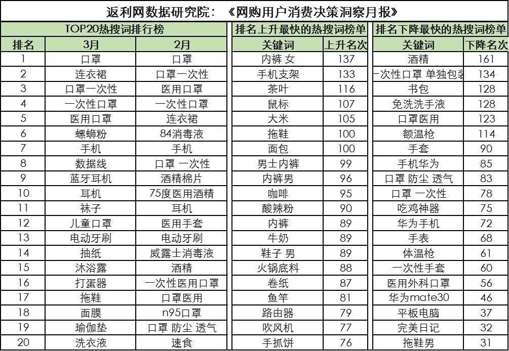 月報顯示,相較2月,消毒液、酒精等防疫相關(guān)搜索詞已跌出了“TOP20熱搜榜”,酒精、洗手液和額溫?fù)尩人阉髟~熱度排名均在百名以外,防疫需求顯著下滑。