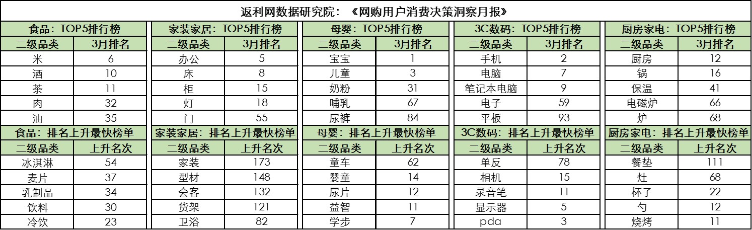 返利網(wǎng)數(shù)據(jù)研究院的相關(guān)負(fù)責(zé)人表示,食品、辦公、母嬰等品類的訂單量排名都在上漲,這也印證了混合辦公形勢下,剛需消費(fèi)需求正在復(fù)蘇。此外,“盡管整個3月份3C數(shù)碼消費(fèi)雖有所下滑,但3月下旬以來,華為、小米等產(chǎn)商陸續(xù)發(fā)布了新品,隨著產(chǎn)能復(fù)蘇,消費(fèi)信心也在逐步恢復(fù),我們對4月份的3C數(shù)碼品類還是充滿期待。”