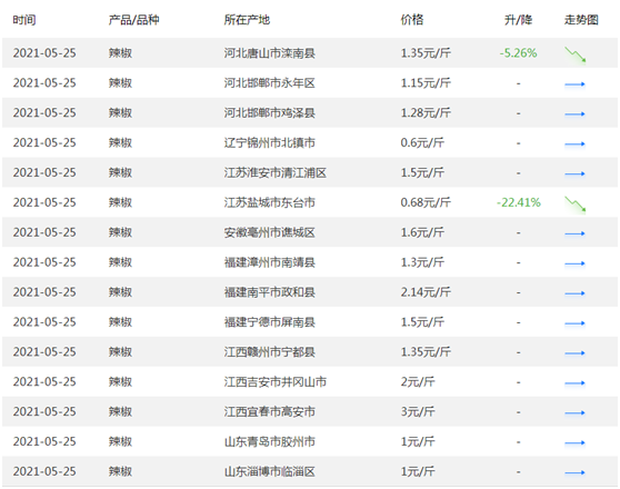 在豬肉價格下跌的同時,辣椒價格也迎來了一輪快速跳水。惠農(nóng)網(wǎng)大數(shù)據(jù)顯示,5月25日,河北、遼寧、江蘇、安徽、福建、江西、山東等多地的辣椒現(xiàn)貨價格已經(jīng)跌至1元/斤至2元/斤的區(qū)間內(nèi)。其中,江蘇鹽城的辣椒現(xiàn)貨受新貨上市影響,一度大跌22.41%,批發(fā)價格跌到0.68元/斤。