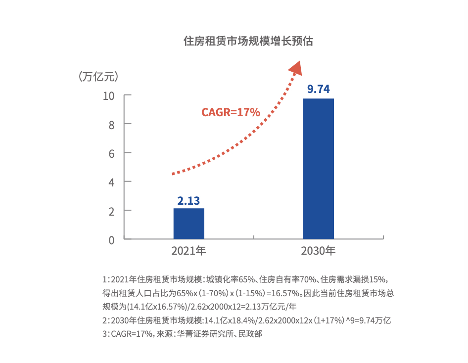 近日,《2021中國城市租住生活藍(lán)皮書》(下稱《藍(lán)皮書》)正式發(fā)布,指出基于我國城鎮(zhèn)化率年平均2%的增速,在2030年我國住房租賃市場規(guī)模將近10萬億元,行業(yè)進(jìn)入發(fā)展的“黃金十年”。