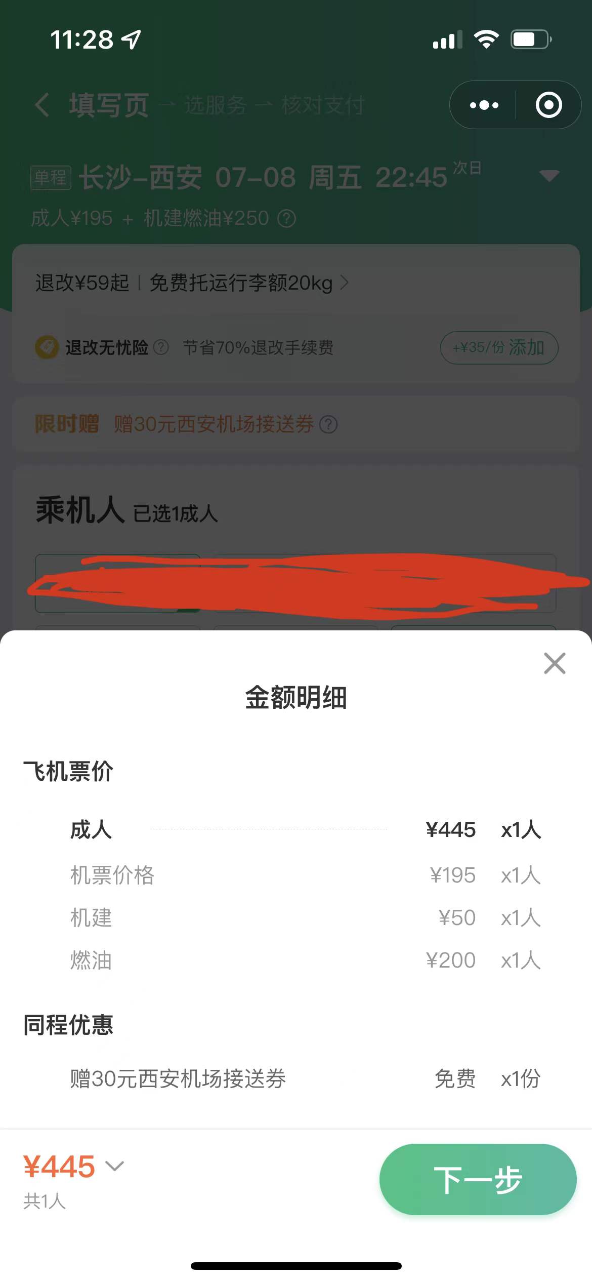 7月5日,記者在同程旅行搜索票價發(fā)現(xiàn),7月6日廣州出發(fā)前往貴陽、7月7日貴陽出發(fā)前往廣州、7月8日長沙出發(fā)前往西安的機票裸價均未超過200元,而燃油附加費和機場建設費價格已經(jīng)達到250元。