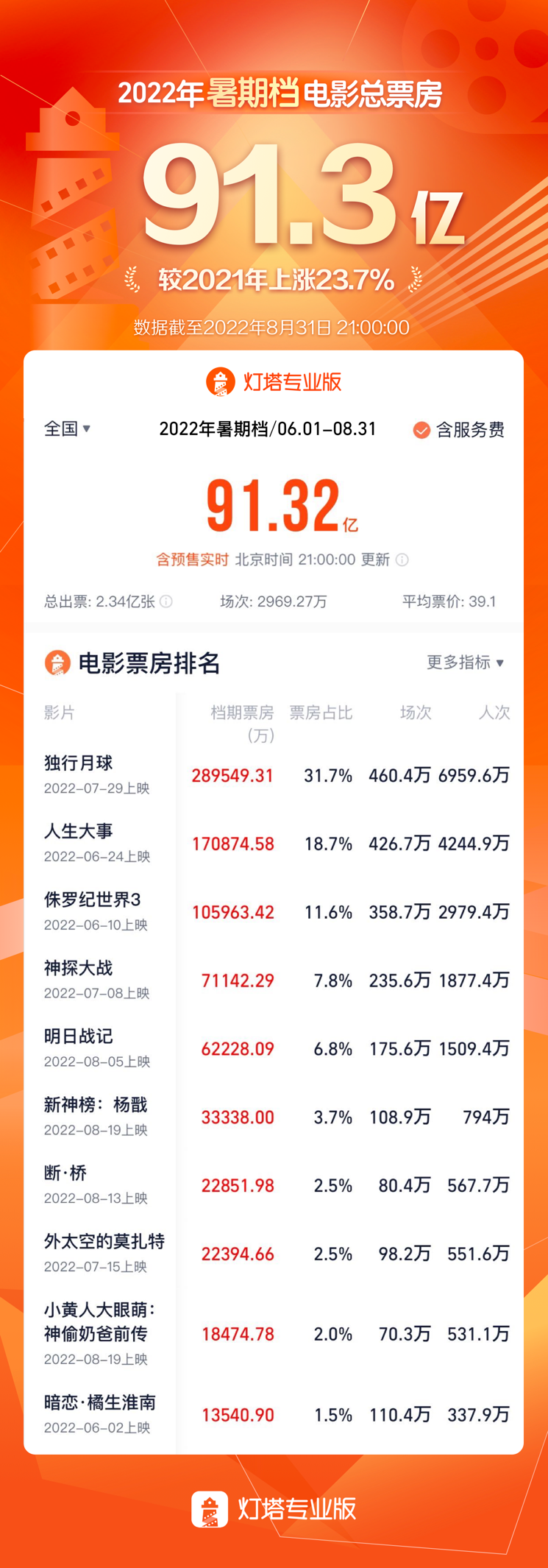 今年暑期檔(6月1日-8月31日)已經(jīng)落幕。燈塔專業(yè)版數(shù)據(jù)顯示,截至8月31日21時,2022年暑期檔總票房91.3億元,同比上漲23.7%;總出票2.34億張,總場次2969.27萬場,平均票價39.1元/張。