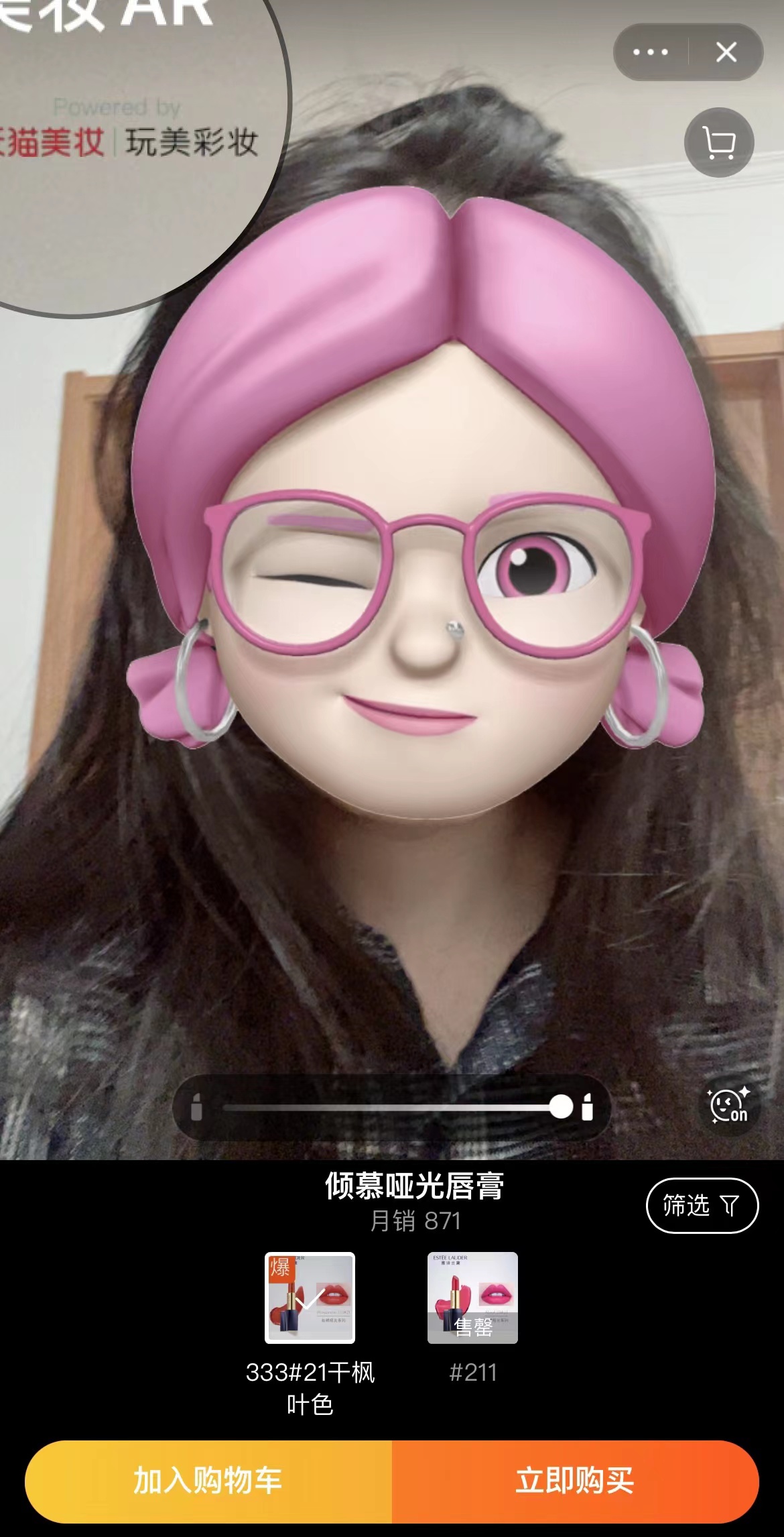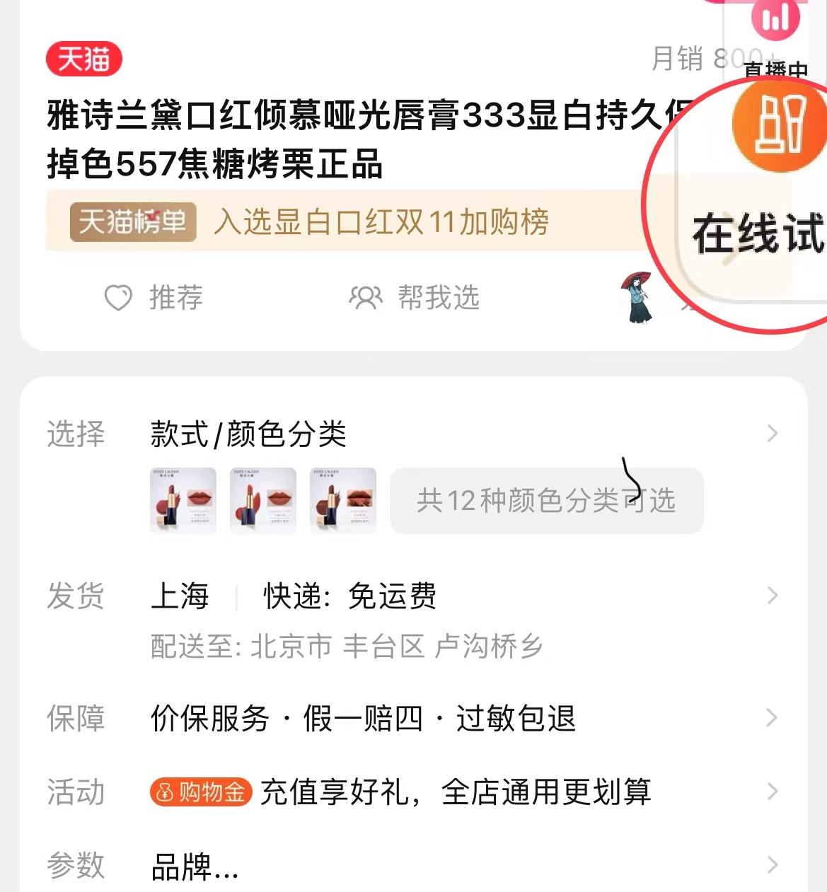 如何吸引?例如,記者搜索發(fā)現(xiàn)天貓部分彩妝旗艦店提供“線上試妝”服務(wù)。在雅詩蘭黛旗艦店的一款口紅頁面,試著點(diǎn)擊在線試妝后,可以滑動(dòng)相關(guān)按鈕,查看該色號的涂抹效果。而頁面左上角則顯示該技術(shù)屬于“玩美彩妝”。