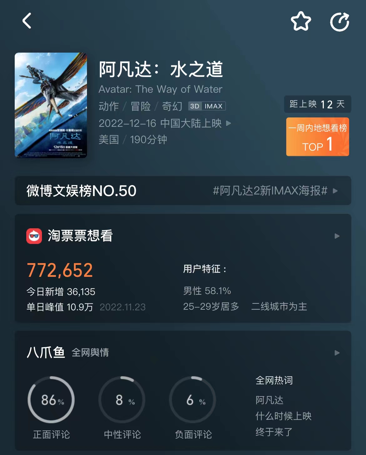 作為《阿凡達(dá)》續(xù)集,《阿凡達(dá)2》由美國(guó)光影風(fēng)暴娛樂(lè)制作,美國(guó)二十世紀(jì)影業(yè)公司出品,中國(guó)電影集團(tuán)公司引進(jìn),中國(guó)電影股份有限公司和華夏電影發(fā)行有限責(zé)任公司發(fā)行。淘票票數(shù)據(jù)顯示,截至12月4日晚7點(diǎn),已有77萬(wàn)人想看,該數(shù)據(jù)仍在增加之中。