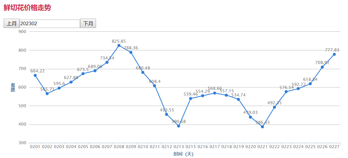 云南昆明國(guó)際花卉拍賣(mài)交易中心發(fā)布的鮮切花指數(shù)近期出現(xiàn)明顯回暖趨勢(shì)。2022年11月至12月,該指數(shù)一度徘徊在200至300區(qū)間內(nèi);進(jìn)入2023年1月,該指數(shù)迅速回升至500上方運(yùn)行;至2023年2月,受情人節(jié)等消費(fèi)窗口期影響,該指數(shù)一度上揚(yáng)至800上方,隨后短暫回落至400下方;由于國(guó)際勞動(dòng)?jì)D女節(jié)消費(fèi)窗口期即將開(kāi)啟,該指數(shù)再度強(qiáng)勁回升,2月27日?qǐng)?bào)777.83,已基本收復(fù)此前跌幅。