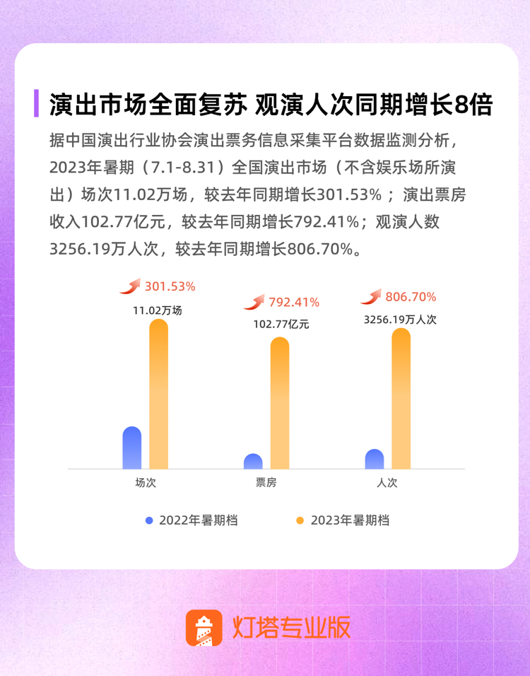 2023暑期檔(7月1日-8月31日)觀演人次3256.19萬人次,較去年同期增長806.70%;演出票房收入102.77億元,較去年同期增長792.41%。