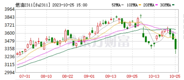 國內(nèi)市場方面,上海期貨交易所掛牌交易的燃油2311期貨合約在夜盤交易時曾一度大跌接近8%,夜盤收盤時仍下跌4.07%,報收于3415點。10月25日,該期貨合約再度下跌5.90%,報收于3350點。該合約自9月28日最高點3892點,已累計下跌13.92%。