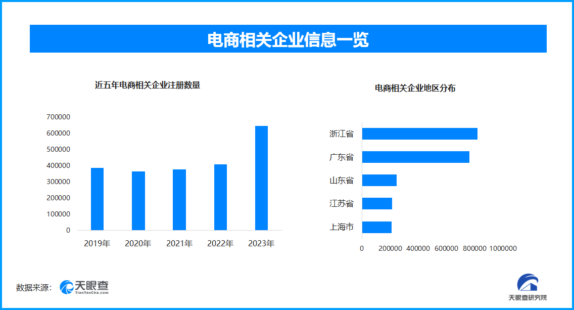 天眼查專(zhuān)業(yè)版數(shù)據(jù)顯示,截至目前,全國(guó)目前現(xiàn)存在業(yè)、存續(xù)狀態(tài)的電商相關(guān)企業(yè)約為375.5萬(wàn)家,其中,2024年1月份-10月份新增注冊(cè)企業(yè)59.6萬(wàn)余家;從電商企業(yè)年度注冊(cè)量可以看出,近5年來(lái),電商相關(guān)企業(yè)注冊(cè)量一直保持高位增長(zhǎng),并于2023年達(dá)到頂峰。從地域分布來(lái)看,浙江省與廣東省兩個(gè)大省并駕齊驅(qū)位列榜首,注冊(cè)量分別為81.9萬(wàn)家和76.2萬(wàn)家;山東省、江蘇省、上海市位列其后,均為20萬(wàn)家左右的量級(jí)。