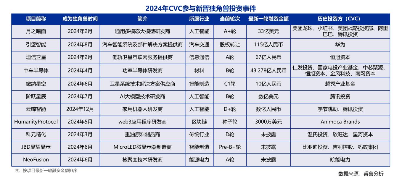 大額投資占近四成,參與半數(shù)獨角獸投資。2024年,一級股權(quán)投資市場投資額過1億美元的大額投資事件83個,其中CVC參投31個,占比37.4%。其中2024年人工智能7個投資額超1億美元的大額事件中均有布局。獨角獸成長方面,CVC助力顯著,2024年國內(nèi)新增20家獨角獸,其中11家有CVC參與投資,占比55%。