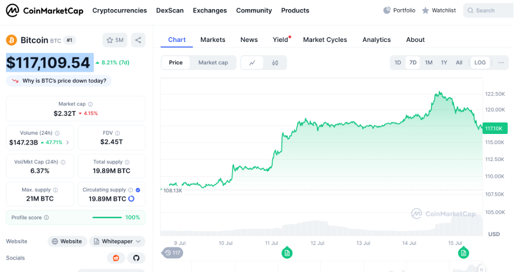不過(guò),此后比特幣價(jià)格有所回調(diào),截至7月15日記者發(fā)稿時(shí),1枚比特幣價(jià)格報(bào)117109.54美元,當(dāng)日跌幅約為4%,但整體看,最近7個(gè)交易日比特幣價(jià)格上漲幅度仍錄得約8.2%。