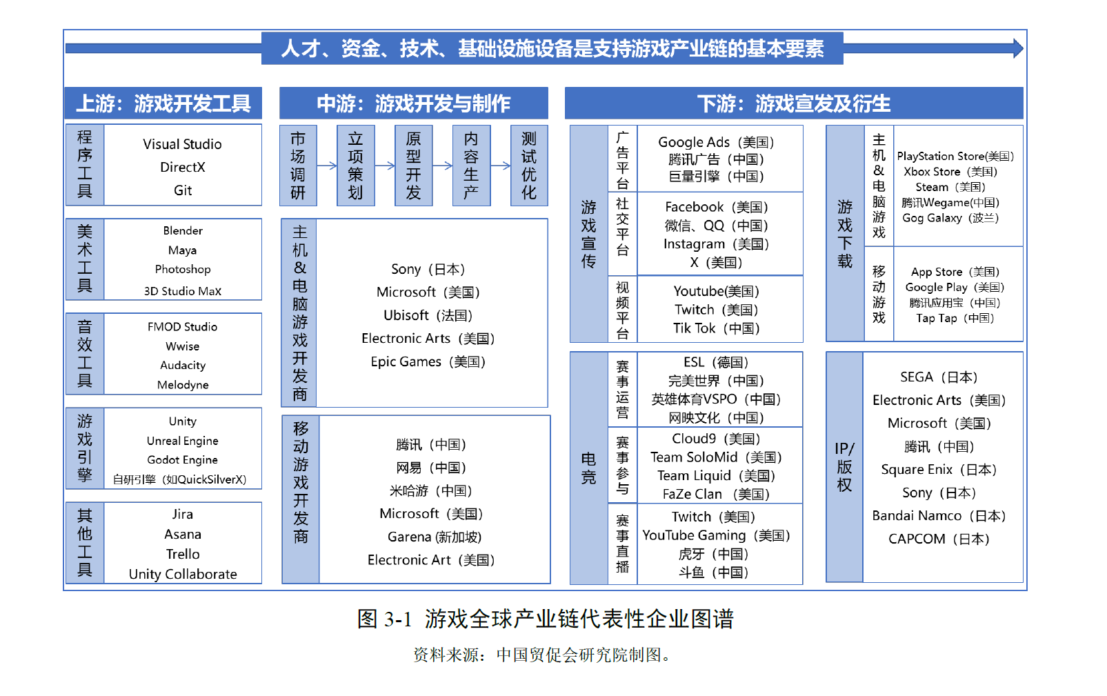 “游戲全球產(chǎn)業(yè)鏈,可分為上游、中游、下游三部分,圍繞中游的游戲研發(fā)企業(yè)展開。”李媛介紹道,游戲上游主要包括游戲研發(fā)中所需的基礎(chǔ)軟件,其中以游戲引擎為最核心工具,目前其主要廠商集中在歐美地區(qū);游戲中游主要是游戲產(chǎn)品研發(fā),目前美國、中國和日本在研發(fā)環(huán)節(jié)處于優(yōu)勢地位,其市場份額分別占比分別為37.7%、31%和21.1%。全球前五大游戲企業(yè)分別為騰訊、微軟、索尼、網(wǎng)易和藝電。