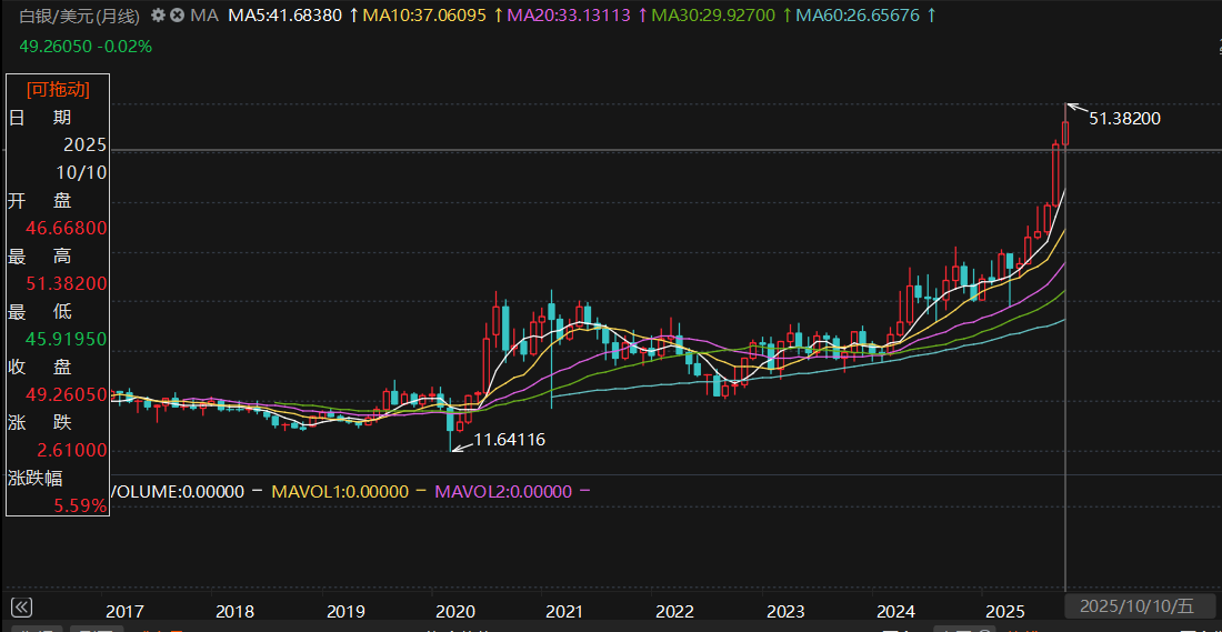 10月9日,現(xiàn)貨白銀價格突破50美元/盎司,為歷史首次。10月10日,據東方財富Choice數(shù)據,白銀開盤價報46.67美元/盎司,最高達51.38美元/盎司,年內漲幅超70%。