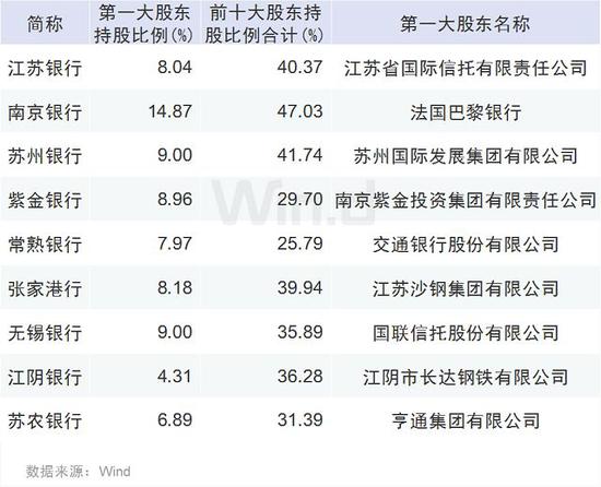值得關(guān)注的是,江蘇A股上市的9家銀行當(dāng)中,均無控股股東和實際控制人,除南京銀行(7.830,0.11,1.42%)第一大股東法國巴黎銀行持股比例為14.87%外,其他8家銀行第一大股東持股比例均低于10%,且從前十大股東持股比例合計來看,均小于50%,如紫金銀行(6.270,0.10,1.62%)、常熟銀行(7.820,0.02,0.26%)前十大股東持股比例合計甚至不到30%。