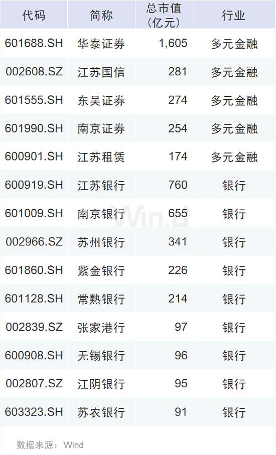 從目前上市公司情況來看,江蘇共有14家金融類上市公司,9家銀行及5家多元金融企業(yè)(包括證券、信托、金融租賃)。從相關(guān)公司總市值來看,除華泰證券(19.650,0.29,1.50%)超過1000億元以外,其余公司總市值相對較低,此外,還有4家農(nóng)商行總市值不足100億元。