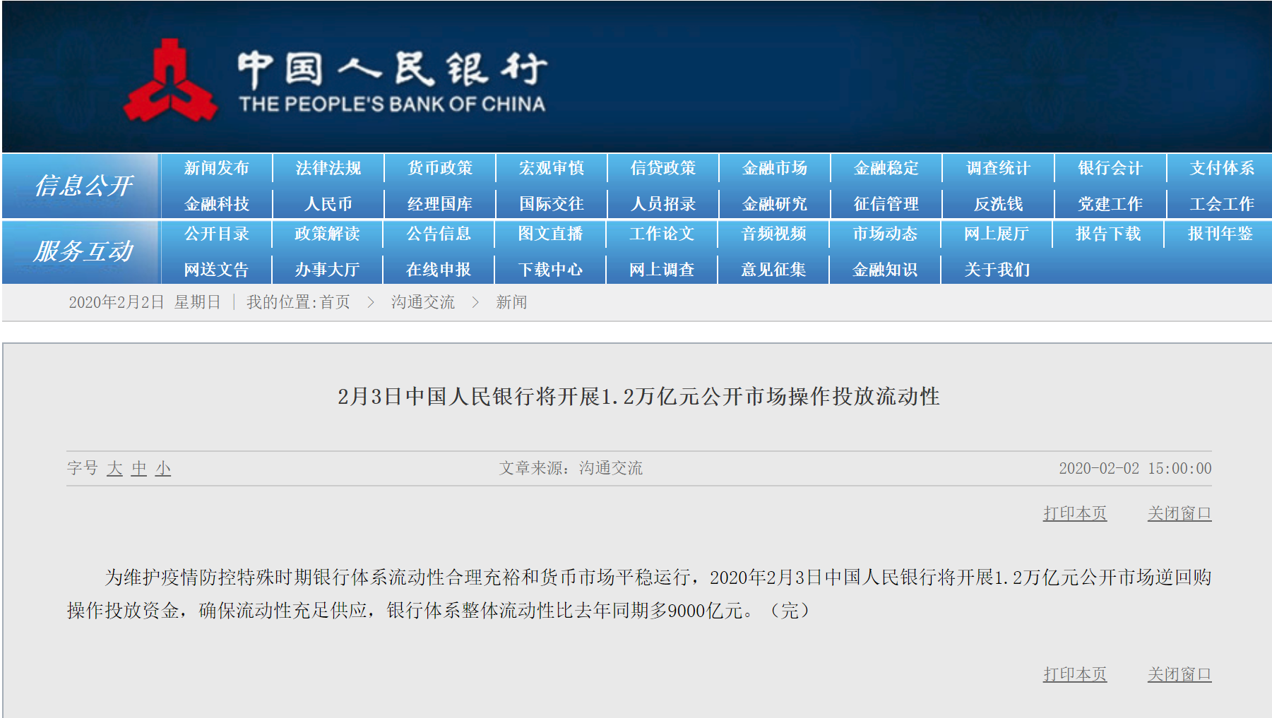 2月2日,央行發(fā)布公告,為維護(hù)疫情防控特殊時(shí)期銀行體系流動(dòng)性合理充裕和貨幣市場(chǎng)平穩(wěn)運(yùn)行,2020年2月3日中國(guó)人民銀行將開(kāi)展1.2萬(wàn)億元公開(kāi)市場(chǎng)逆回購(gòu)操作投放資金,確保流動(dòng)性充足供應(yīng),銀行體系整體流動(dòng)性比去年同期多9000億元。