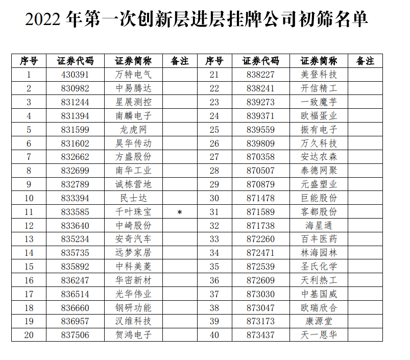 4月11日,全國(guó)股轉(zhuǎn)公司發(fā)布消息顯示,近期,全國(guó)股轉(zhuǎn)公司按計(jì)劃開展了2022年首次創(chuàng)新層進(jìn)層實(shí)施工作,經(jīng)掛牌公司自查、主辦券商核查、全國(guó)股轉(zhuǎn)公司初篩等程序,于2022年4月11日發(fā)布2022年首批擬調(diào)入創(chuàng)新層的掛牌公司(以下簡(jiǎn)稱首批擬進(jìn)層公司)初篩名單,共計(jì)40家公司擬調(diào)入創(chuàng)新層。