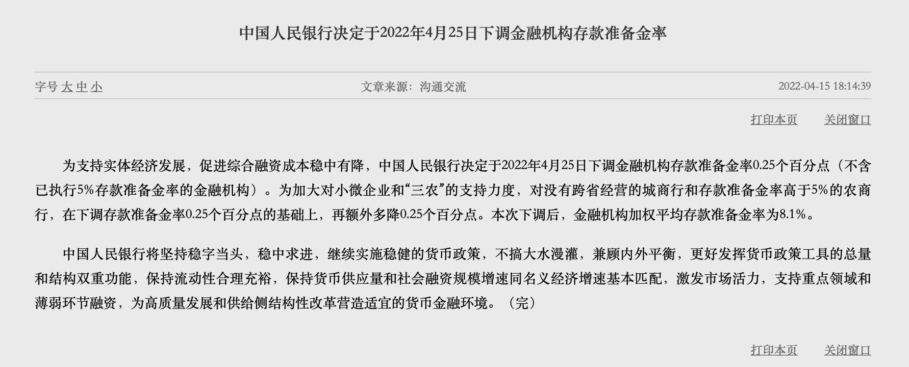 為支持實體經(jīng)濟發(fā)展,促進(jìn)綜合融資成本穩(wěn)中有降,中國人民銀行決定于2022年4月25日下調(diào)金融機構(gòu)存款準(zhǔn)備金率0.25個百分點(不含已執(zhí)行5%存款準(zhǔn)備金率的金融機構(gòu))。為加大對小微企業(yè)和“三農(nóng)”的支持力度,對沒有跨省經(jīng)營的城商行和存款準(zhǔn)備金率高于5%的農(nóng)商行,在下調(diào)存款準(zhǔn)備金率0.25個百分點的基礎(chǔ)上,再額外多降0.25個百分點。本次下調(diào)后,金融機構(gòu)加權(quán)平均存款準(zhǔn)備金率為8.1%。