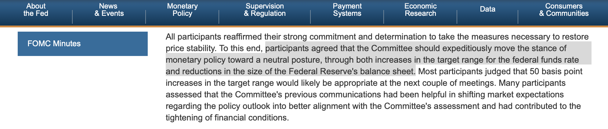 值得關(guān)注的是,此次會議似乎也暗示了接下來的加息路徑。會議紀(jì)要顯示,與會者一致認為,委員會應(yīng)通過提高聯(lián)邦基金利率目標(biāo)范圍和減少美聯(lián)儲資產(chǎn)負債表規(guī)模,迅速將貨幣政策立場轉(zhuǎn)向中性姿態(tài)。大多數(shù)與會者認為,在接下來的幾次會議上,將目標(biāo)范圍提高50個基點可能是合適的。