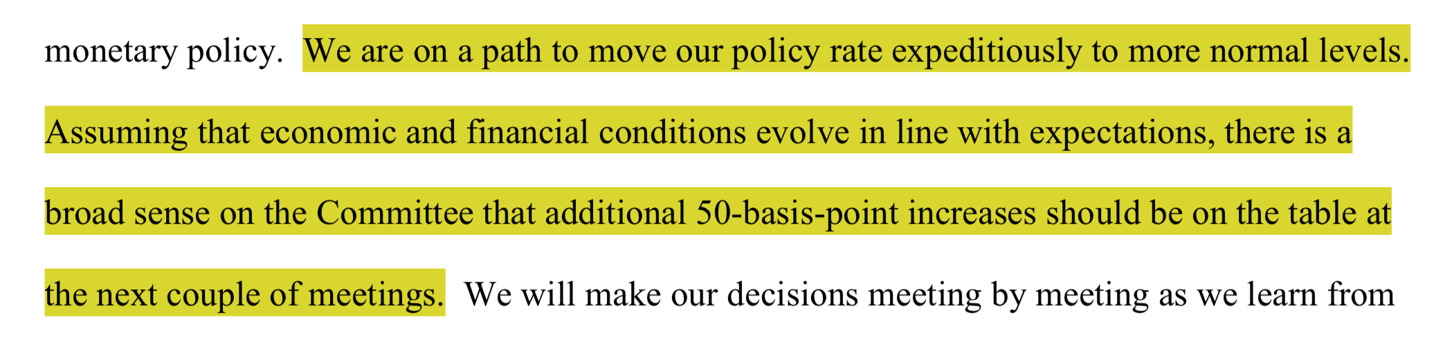 美聯(lián)儲主席鮑威爾也在會后的新聞發(fā)布會上談道,“我們正在將政策利率迅速提高到更正常的水平,假設(shè)經(jīng)濟和金融狀況的發(fā)展符合預(yù)期,委員會普遍認為,在接下來的幾次會議上應(yīng)該考慮再增加50個基點”。