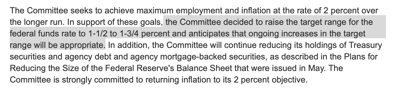 另外,聲明中還顯示,委員會將繼續(xù)減少其持有的國債和機構(gòu)債務(wù)以及抵押貸款支持證券(MBS),正如5月份發(fā)布的《減少美聯(lián)儲資產(chǎn)負債表規(guī)模的計劃》中所描述的一樣。委員會堅定地致力于將通貨膨脹率恢復(fù)到2%的目標(biāo)。
