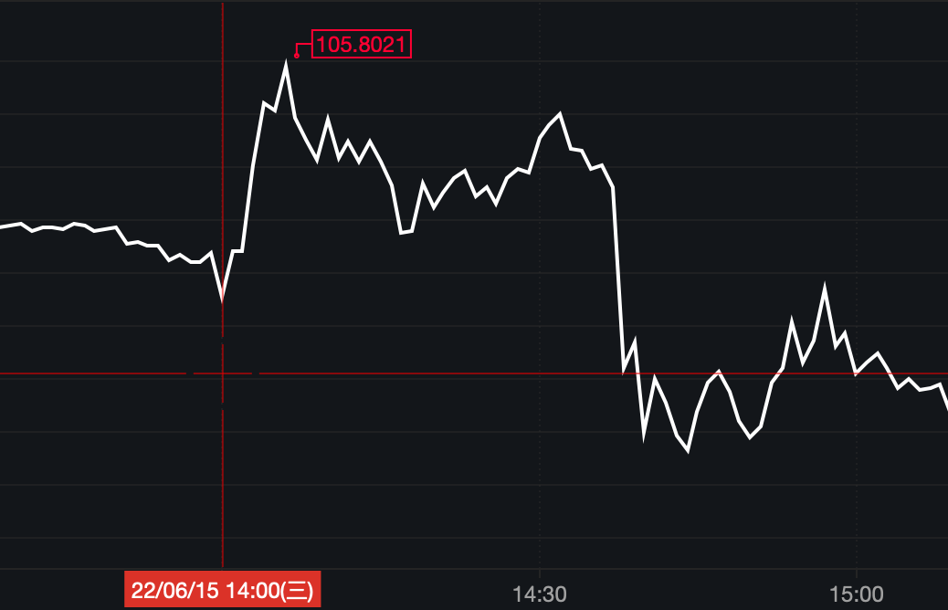 美債方面,在美聯(lián)儲宣布加息75個基點后,10年期美債收益率快速走高——北京時間6月16日凌晨2點,10年期美債報3.398%,20分鐘后升至3.437%。隨后開始震蕩下行,截至北京時間6月16日11點,10年期美債收益率報3.356%。