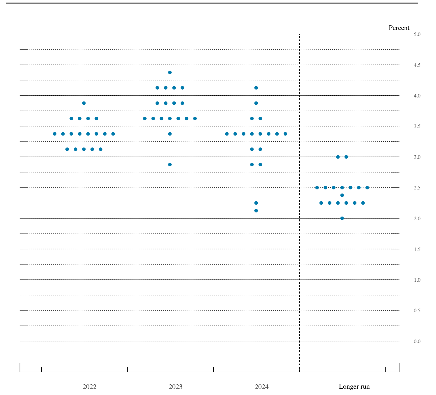 18名委員中,有13名預(yù)計到2022年底聯(lián)邦基金利率區(qū)間將達到或高于3.25%-3.5%;有16名預(yù)計到2023年底聯(lián)邦基金利率區(qū)間將達到或高于3.50%-3.75%。
