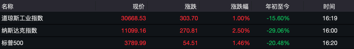 激進加息落地后,美股表現(xiàn)較為積極。道瓊斯指數(shù)收報30668.53點,上漲1.00%;納斯達克指數(shù)收報11099.16點,上漲2.50%;標(biāo)普500指數(shù)收報3789.99點,上漲1.46%。