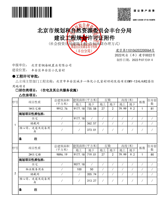 北京首鋼海賦置業(yè)有限公司于2022年6月1日通過掛牌出讓形式取得豐臺區(qū)小瓦窯村XWY-13地塊項目建設用地使用權,拿地后僅30天就取得了建設工程規(guī)劃許可證,繼華潤置地紀家廟項目后,再次刷新了豐臺區(qū)集中供地以來辦理建設工程規(guī)劃許可證的記錄。