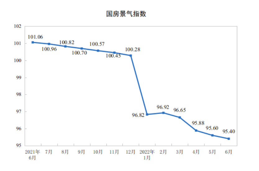 6月份,房地產(chǎn)開發(fā)景氣指數(shù)(簡稱“國房景氣指數(shù)”)為95.40。