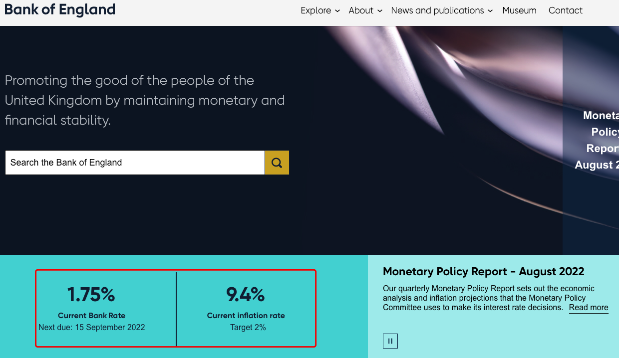 (圖說:英國央行將基準利率提升至1.75%,當前英國的通脹率已高達9.4%,超目標2%四倍多;圖片來源:英國央行官網)