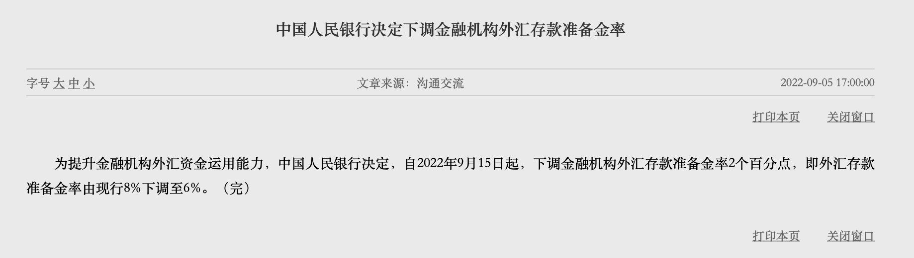 央行:9月15日起下調金融機構外匯存款準備金率2個百分點2022-09-05 17:24