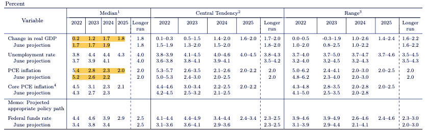 其中,2022年全年的GDP增長預(yù)期由6月份的1.7%下調(diào)至0.2%,2023年由1.7%下調(diào)至1.2%,均低于其預(yù)測(cè)的長期增長速度1.8%。同時(shí),2022年P(guān)CE通脹預(yù)期由6月份的5.2%調(diào)高至5.4%,2023至2024年通脹水平也有小幅上調(diào)。