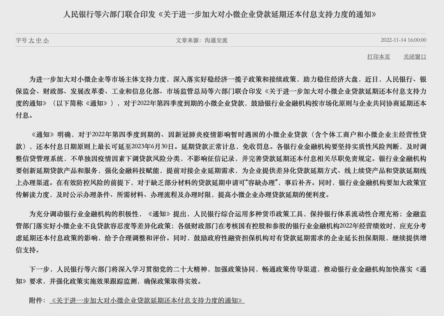 11月14日,中國人民銀行網(wǎng)站發(fā)布消息稱,人民銀行、銀保監(jiān)會、財政部、發(fā)展改革委、工業(yè)和信息化部、市場監(jiān)管總局等六部門聯(lián)合印發(fā)《關于進一步加大對小微企業(yè)貸款延期還本付息支持力度的通知》(以下簡稱《通知》),對于2022年第四季度到期的小微企業(yè)貸款,鼓勵銀行業(yè)金融機構按市場化原則與企業(yè)共同協(xié)商延期還本付息。