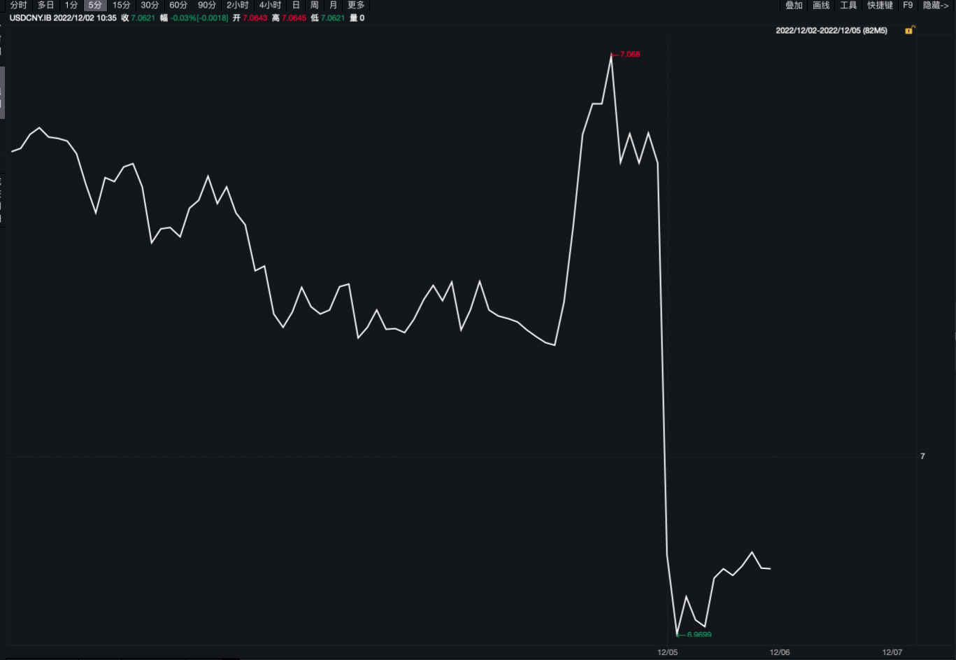 Wind數(shù)據(jù)顯示,12月5日亞洲交易時段盤中,在岸、離岸人民幣對美元匯率出現(xiàn)強(qiáng)勢拉升,雙雙收復(fù)“7”關(guān)口。這是自今年9月中旬人民幣對美元匯率“跌破7”以來,重回“6”字頭。