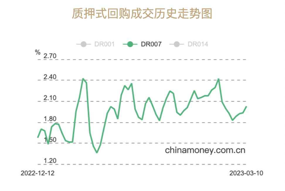 從資金價(jià)格來看,上周前四個(gè)交易日資金面延續(xù)前一周的寬松局面。據(jù)中國(guó)貨幣網(wǎng)數(shù)據(jù)顯示,3月6日DR007加權(quán)平均利率1.8253%,為本月以來最低,隨后開始向上。3月10日,DR007加權(quán)平均利率升至政策利率水平(2%)上方報(bào)2.0253%。