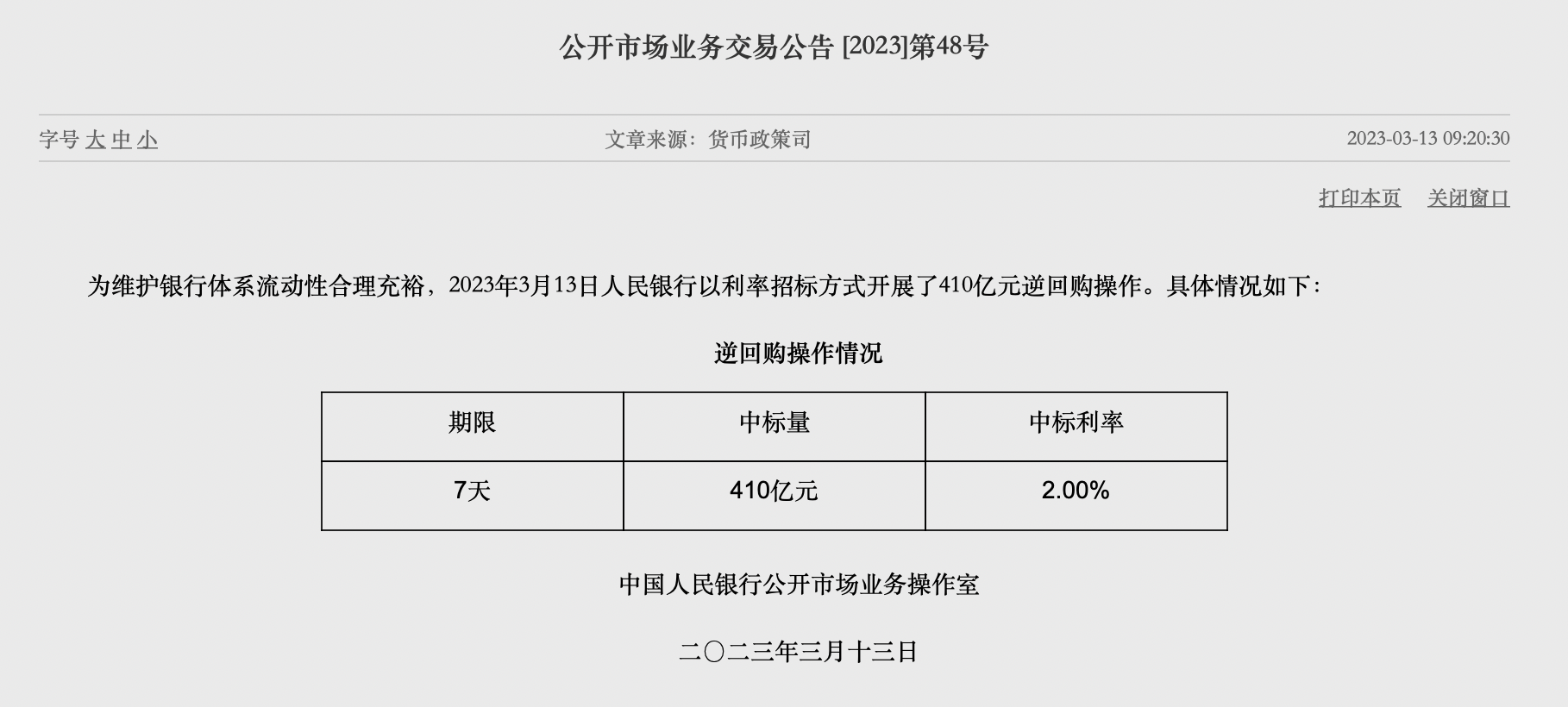 央行開展410億元逆回購(gòu)操作 實(shí)現(xiàn)凈投放340億元2023-03-13 10:30