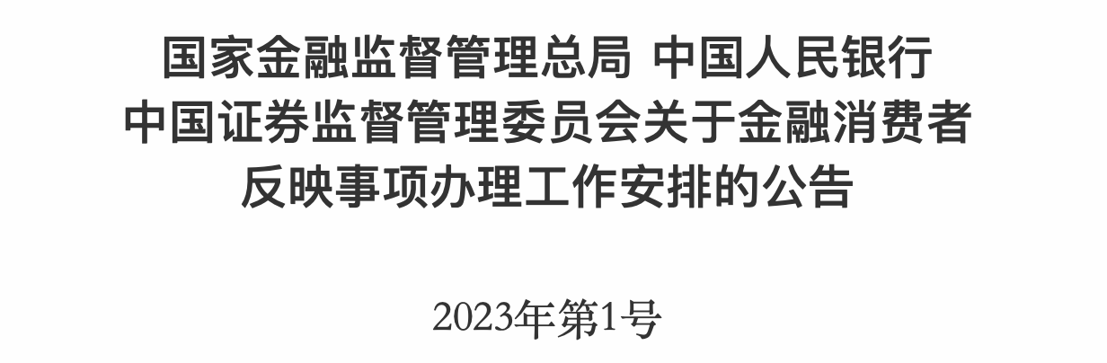 6月2日,國家金融監(jiān)督管理總局網(wǎng)站發(fā)布其揭牌后的“1號文”,其與中國人民銀行、中國證券監(jiān)督管理委員會聯(lián)合發(fā)布《關于金融消費者反映事項辦理工作安排的公告》(下稱《公告》)。