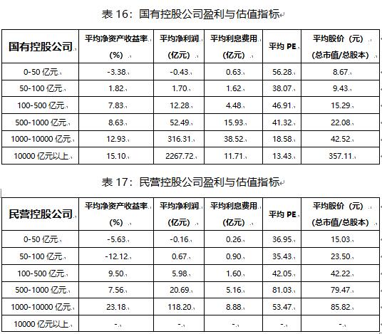 但是,對(duì)比國有控股公司和民營控股公司的盈利表現(xiàn)來看,我們發(fā)現(xiàn):(1)從平均凈資產(chǎn)收益率指標(biāo)看,市值在100-500億元和1000-10000億元的兩類區(qū)間中(2022年底,民營控股公司沒有萬億市值以上的公司),國有控股上市公司的平均凈資產(chǎn)收益率都低于民營控股公司的相同指標(biāo),特別是在市值1000-10000億元的區(qū)間中,民營控股公司的平均凈資產(chǎn)收益率是國有控股公司系統(tǒng)指標(biāo)的1.79倍。(2)從平均利息費(fèi)用指標(biāo)看,國有控股公司的利息費(fèi)用在所有市值區(qū)間,都明顯公司高于民營控股公司,特別是,在市值500-1000億元的區(qū)間中,國有控股公司的平均利息費(fèi)用15.93億元,民營控股公司的平均利息費(fèi)用是5.16億元,前者是后者的3.09倍。在市值1000-10000億元的區(qū)間中,國有控股公司的平均利息費(fèi)用是38.52億元,民營控股公司的相同指標(biāo)是8.88億元,前者是后者的4.34倍。(3)從PE倍數(shù)看,在市值500億元以下的區(qū)間中,國有控股公司的平均PE都高于民營控股公司,但是,在市值500-1000億元和1000-10000億元的兩個(gè)區(qū)間中,國有控股公司的平均PE分別為41.32倍和18.58倍,都明顯低于民營控股公司的平均PE的81.03倍和53.47倍。(4)從平均股價(jià)看,無論在哪一類市值區(qū)間,國有控股公司的股價(jià)都低于民營控股公司的股價(jià),其中,在500-1000億元市值區(qū)間,民營控股公司的平均股價(jià)79.47元,甚至達(dá)到國有控股公司相同指標(biāo)(22.08元)的3.60倍;在市值1000-10000億元區(qū)間內(nèi),民營控股公司的平均股價(jià)85.82元是國有控股公司相同指標(biāo)(42.52元)的2.02倍。